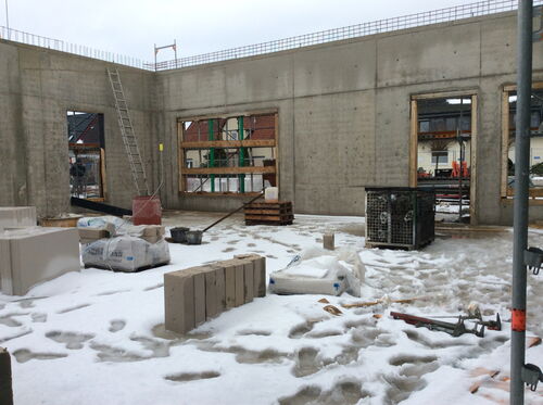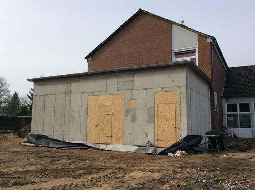 das Technikgebäude am Klassenraumtrakt ist im Rohbau fertig. Es kann mit dem Innenausbau begonnen werden.